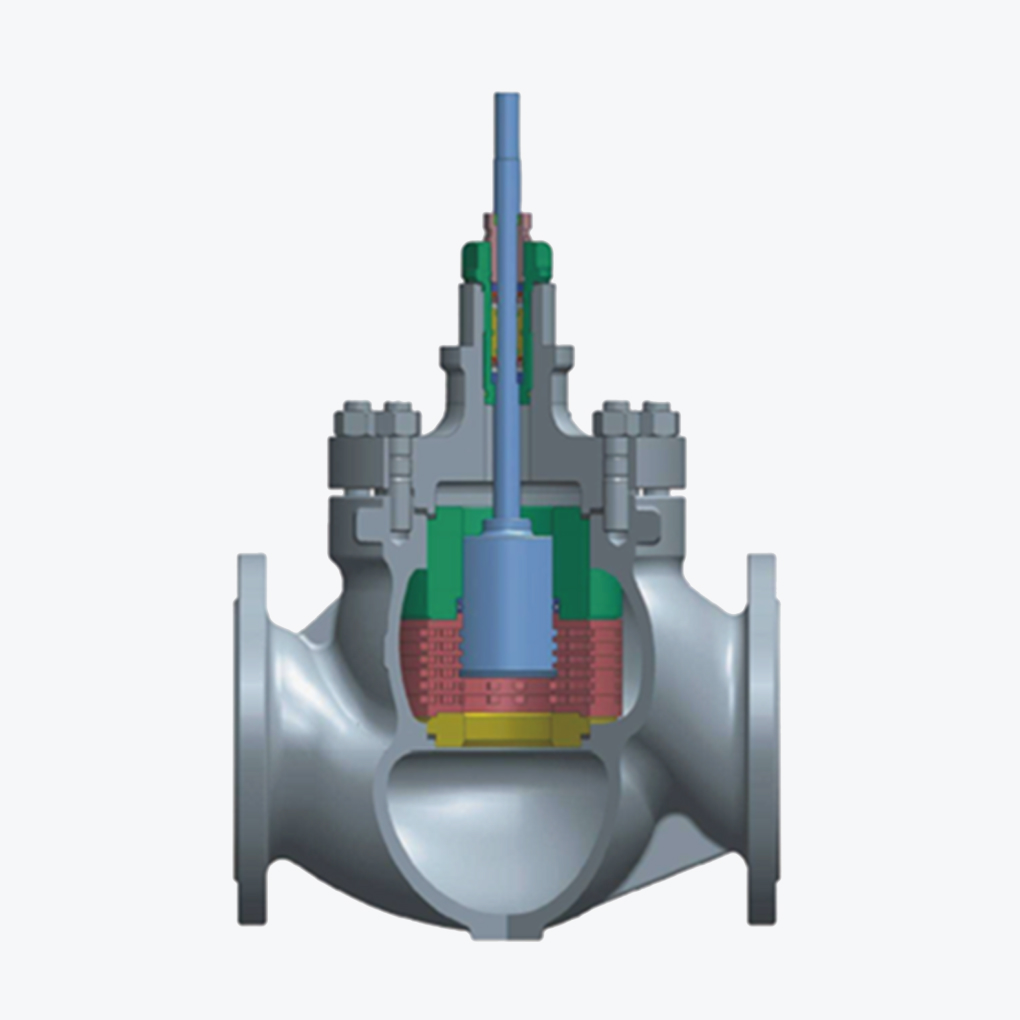 GL/GV5000 시리즈 밸런스형 미로 제어 밸브는 미로 케이지 및 플러그 설계를 특징으로 합니다. 미로 슬리브는 다수의 동축으로 배열된 미로 구조를 가진 원통형 디스크들로 구성되며, 유체의 특성에 따라 다양한 규격의 미로가 설계됩니다. 이 케이지는 유체를 여러 개의 곡선형 유로로 분산시켜 흐름을 분할하며, 유체가 반복적으로 방향을 바꾸도록 유도함으로써 압력을 단계적으로 저하시켜 플래시 증발 및 공동현상(Cavitation)을 방지하고, 트림의 수명을 연장합니다. 밸런스형 슬리브 플러그는 누설을 최소화하며, 막힘이나 공동현상이 발생하기 쉬운 운전 조건에서도 안정적인 제어가 가능합니다.